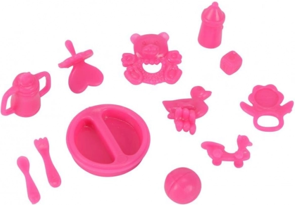 Komplektā ir dažādas rozā plastmasas rotaļlietas, piemēram, šķīvis, galda piederumi un pudele, kas bagātina rotaļu pieredzi.