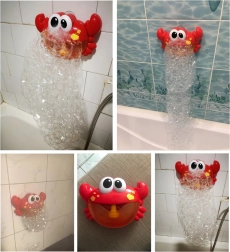 Šis mīlīgais krabis pārvērtīs vannas laiku par jautru šovu, pilnu ar burbuļiem. Noņemamajā tvertnē vienkārši ielejiet ūdeni un nelielu daudzumu vannas putu, nospiediet pogu ON, un krabis sāks radīt bagātīgas putas, ko pavadīs patīkama melodija. Ideāli bērniem, kuri mīl ūdeni, kā arī mazajiem, kuriem vannošanās ne pārāk patīk — rotaļīgā forma viņus droši vien aizraus.