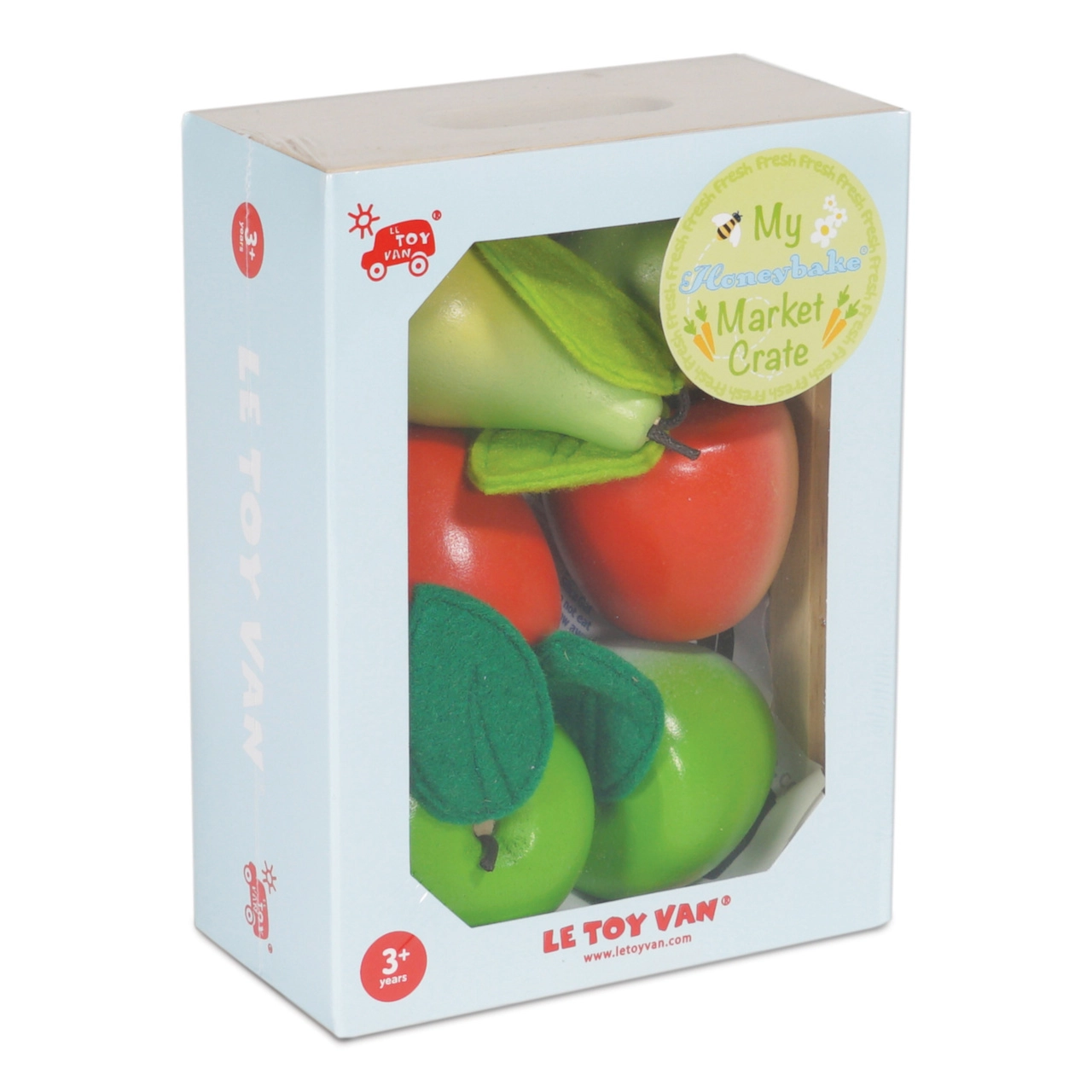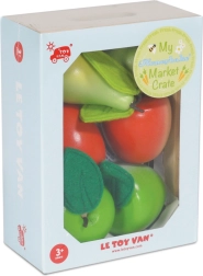 Izbaudiet dienu “tirgū” ar šo skaisto LE TOY VAN koka kastīti, pilnu ar augļiem. Komplektā ir divi sarkani un divi zaļi āboli, kā arī divi zaļi bumbieri ar filca lapiņām. Rotaļlieta izgatavota no ilgtspējīga koka, krāsota ar netoksiskām ūdens bāzes krāsām un lieliski piemērota mazām rociņām. Veicina iztēles spēles, sīko motoriku un mācības par veselīgu uzturu.