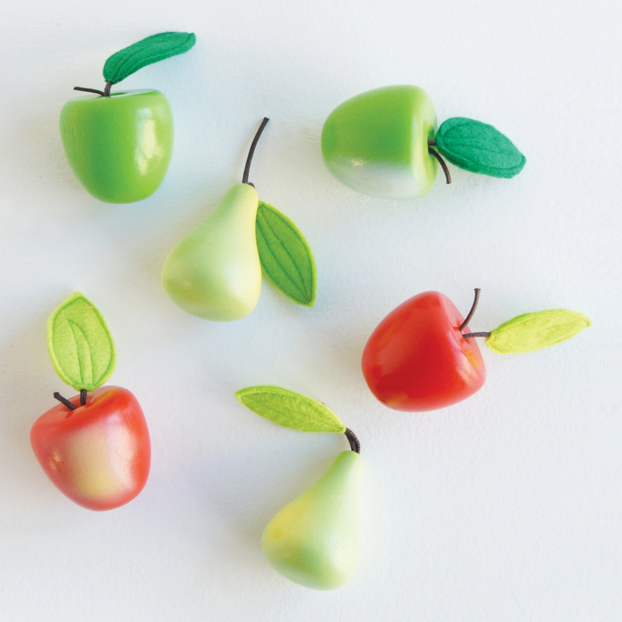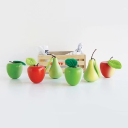 - 6 augļu gabali (2 sarkani āboli, 2 zaļi āboli, 2 zaļi bumbieri) + 1 koka kastīte