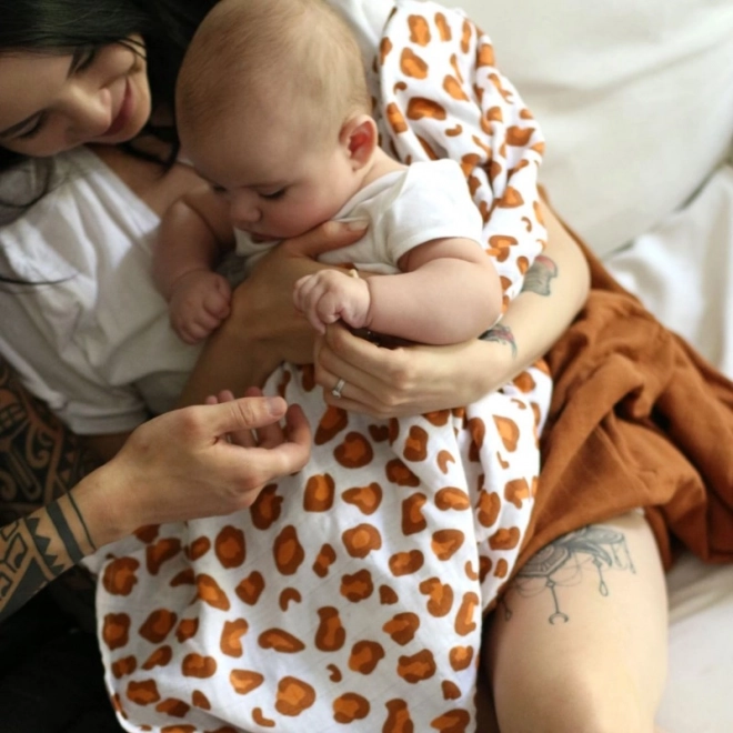 Pateicoties dāsnajiem izmēriem 120 × 120 cm, tas ir ideāls ietīšanai, pārklāšanai un ikdienas aprūpei mājās un ceļā. Stilīgais baltā leoparda motīvs iepriecinās vecākus, kuri meklē praktisku aksesuāru ar modernu dizainu.