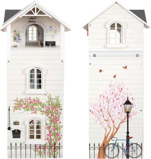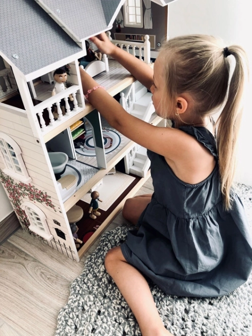 Leļļu namam ir gaiša ārējā fasāde, mūsdienīgs dizains un funkcionāli elementi, piemēram, bīdāmās durvis un atverami logi.
