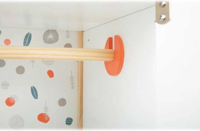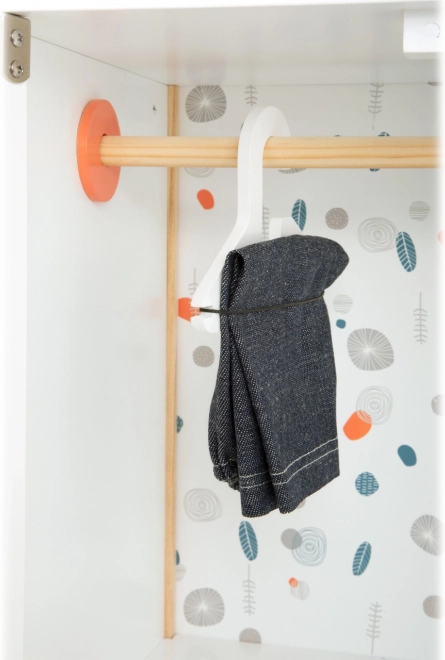 Uzturiet leļļu drēbītes un aksesuārus perfekti sakārtotus ar šo ietilpīgo koka skapīti skandināvu dizainā. Tas piedāvā drēbju stieni ar pakaramajiem, noņemamas plauktiņus un praktisku atvilktni. Pateicoties noapaļotām malām un neitrālām krāsām, tas lieliski iederas jebkurā bērnistabā un veicina kārtības mācīšanos un rūpju prasmju attīstību.