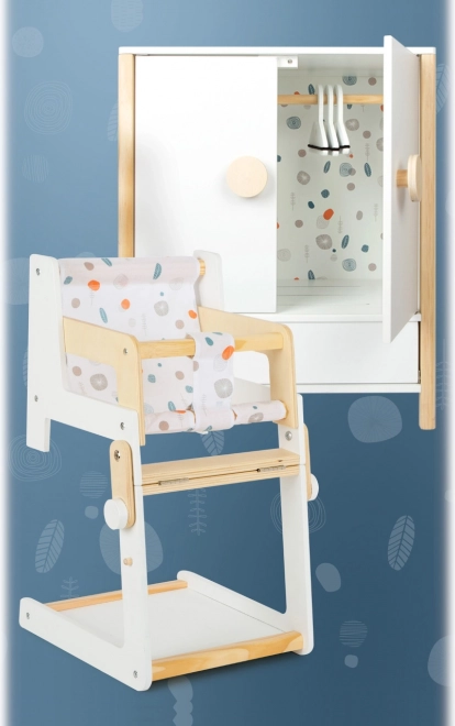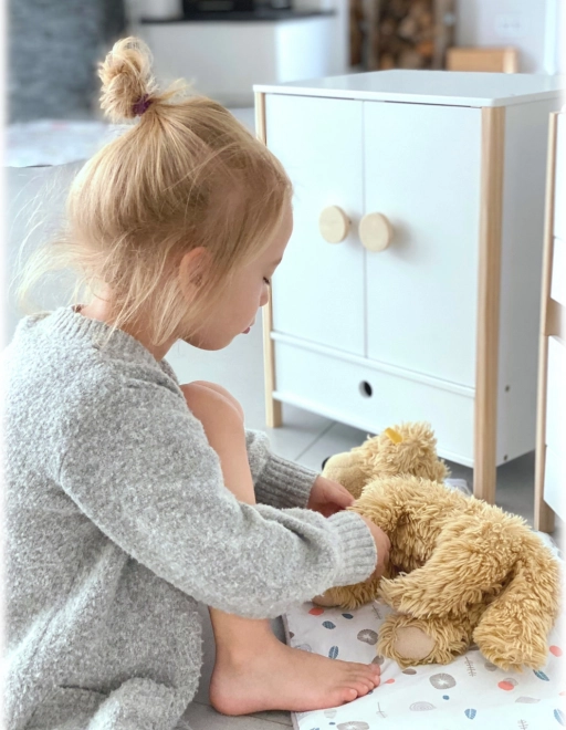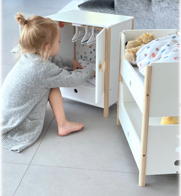 Izturīga koka konstrukcija, stabils izpildījums un drošas, noapaļotas malas nodrošina ērtu un drošu rotaļāšanos. Skapītis veicina patstāvību, kārtības izjūtu un attīsta iztēli, spēlējoties par rūpēm par lellēm.