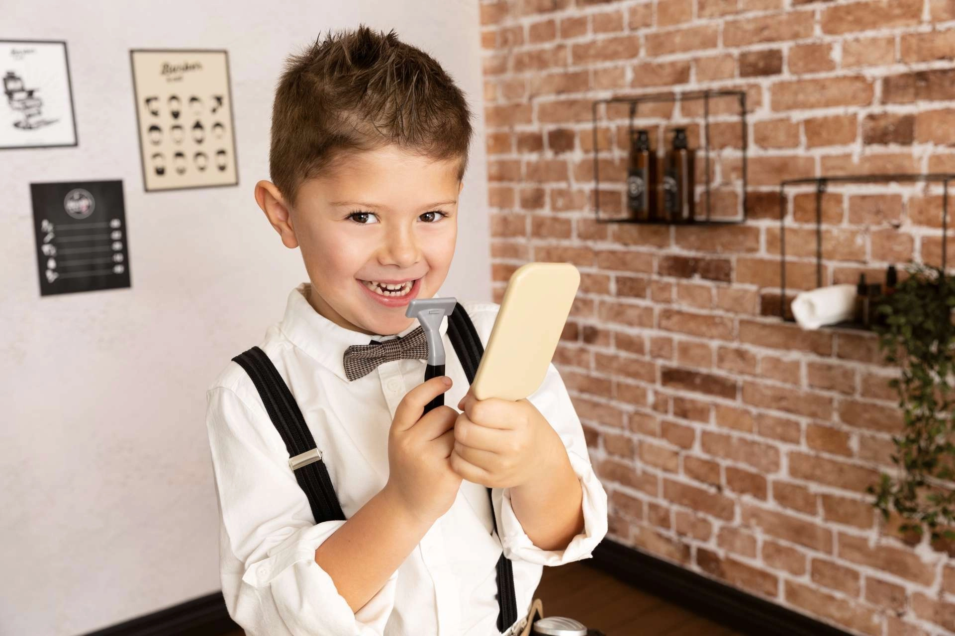 Spogulītis, šķēres, ķemme, ota, skuveklis un citi aksesuāri nodrošina stundām ilgu drošu un radošu izklaidi bērniem no 3 gadu vecuma.