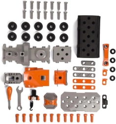 - Bagātināts ar dažādiem instrumentiem, piemēram, skrūvgriezi, riteņiem, skrūvēm, uzgriežņiem un atslēgu.