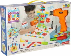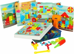 Komplekts ar mozaīkas plāksni ļauj bērniem, izmantojot rotaļu urbi, skrūvgriezi un atslēgu, ieskrūvēt krāsainas skrūves un veidot daudzveidīgus attēlus un telpiskus modeļus. Iedzīviniet bērna iztēli – vienīgais ierobežojums ir mazā konstruktora fantāzija.