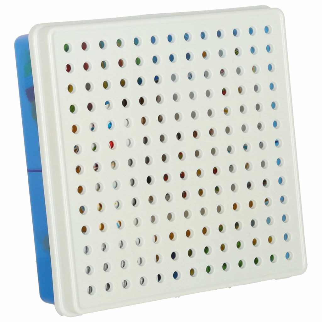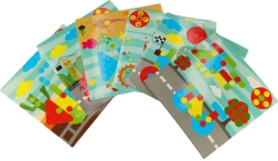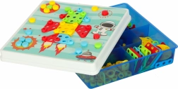 Perforētā plāksne un attēlu kartītes palīdz viegli salikt raķetes, dzīvniekus un pašas idejas – formu un krāsu apgūšana kļūst par rotaļu.