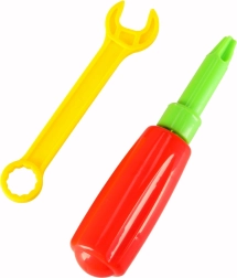 Bērni var skrūvēt kā īsti meistari ar drošu bateriju urbi, skrūvgriezi un atslēgu – lieliski motorikas treniņam.