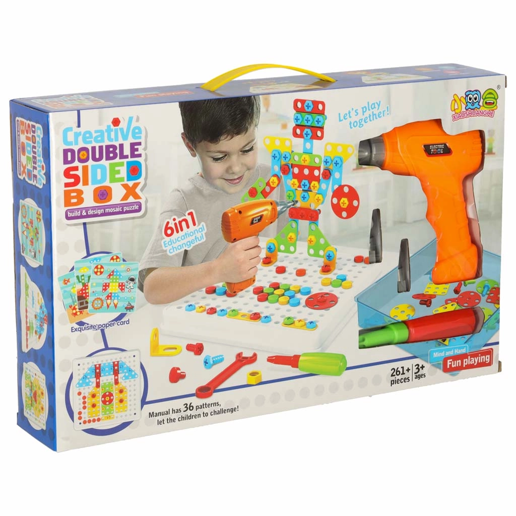 Aizraujošs izglītojošs celtniecības komplekts mazajiem meistariem ar elektrisku rotaļu urbi, skrūvēm un mozaīkas plāksni. Bērni trenēs sīko motoriku, radošumu un tehnisko domāšanu, veidojot krāsainus rakstus un pašu konstrukcijas. Praktiskais koferītis atvieglo pārnēsāšanu, bet bagātīgais 261 detaļas komplekts nodrošina stundām ilgu lielisku rotaļu.