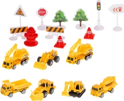 Komplektā ir ekskavators, betona maisītājs, buldozers, pašizgāzējs, ceļamkrāns un citas mašīnas, papildinātas ar ceļazīmēm, konusiem un kociņiem, lai veidotu savus būvlaukumus.