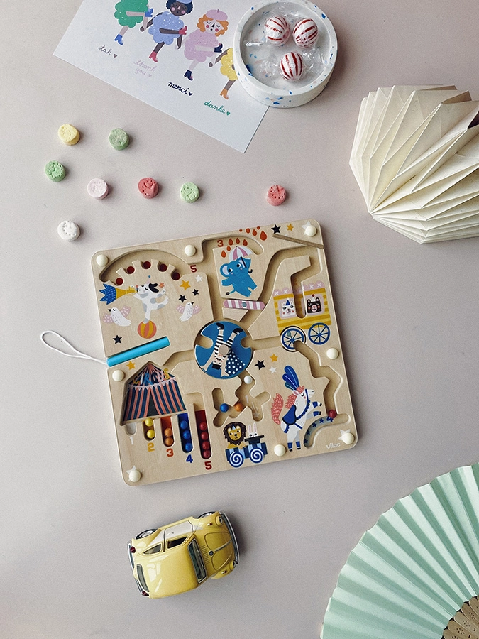 Magnētiskais labirints VILAC iepazīstina bērnus no 2 gadu vecuma ar cirka pasauli maigās Michelle Carlslund krāsās. Ar magnētisku burvju pildspalvu viņi virza bumbiņas pa trasēm, satiekas ar akrobātiem, dzīvniekiem un klauniem, un beigās atgriež katru bumbiņu pareizajā vietā pēc krāsas un skaitļa. Spēle dabiski attīsta koncentrēšanos un pacietību.