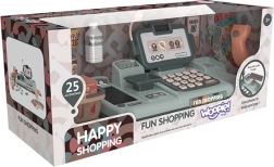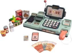 Komplektā ietilpst kase ar svariem, terminālis, kalkulators, skeneris un daudzi piederumi, tostarp rotaļu viedtālrunis un dažādi plastmasas pārtikas produkti.