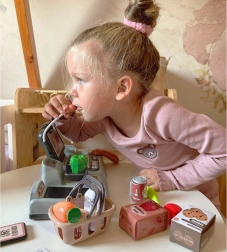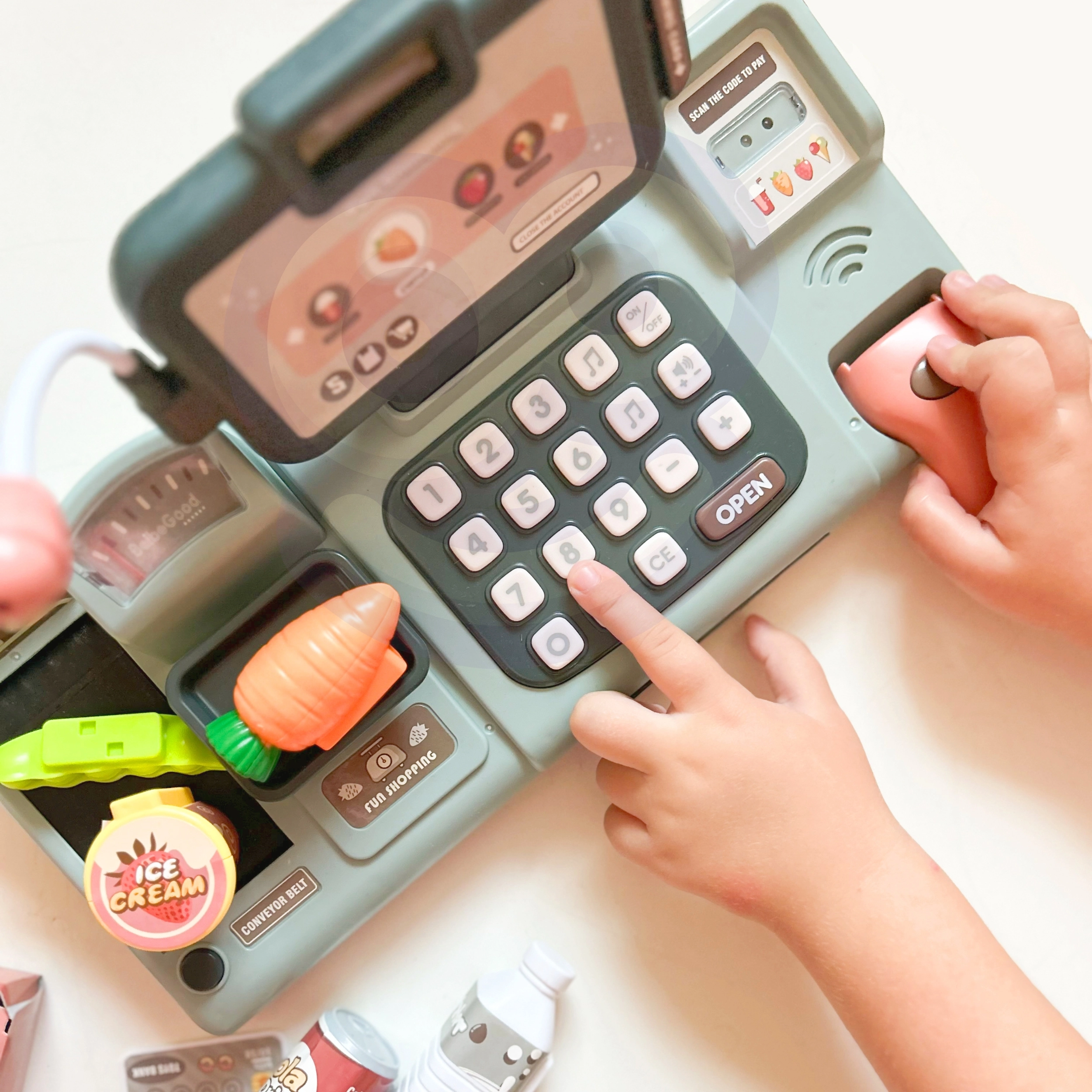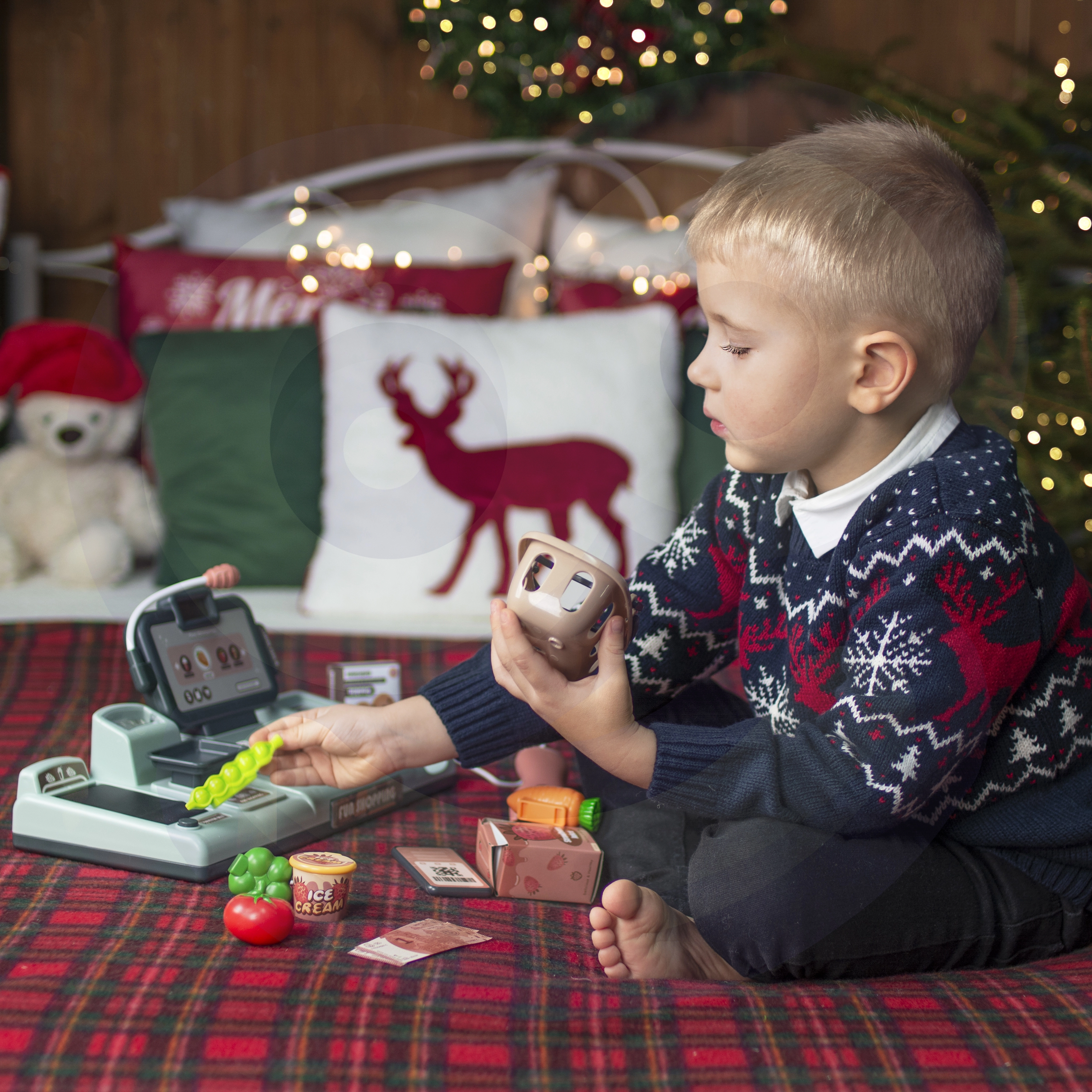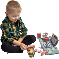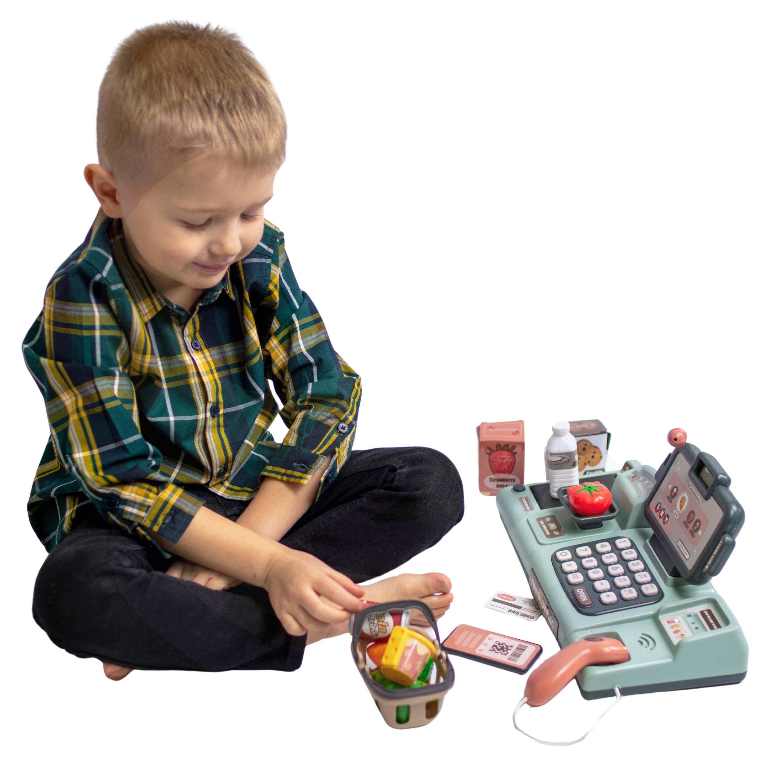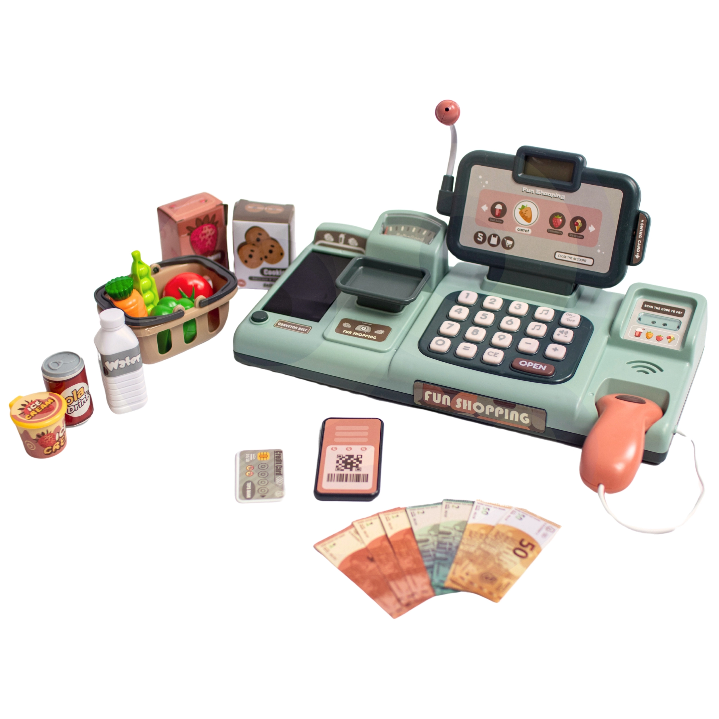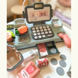 Kase ietver termināli, pateicoties kuram bērns var veikt maksājumus skaidrā naudā, ar karti vai viedtālruni – gluži kā pieaugušie veikalā. Integrētie svari un kustīgā lente ļauj bērnam sakārtot pirkumus un iejusties pārdevēja lomā.