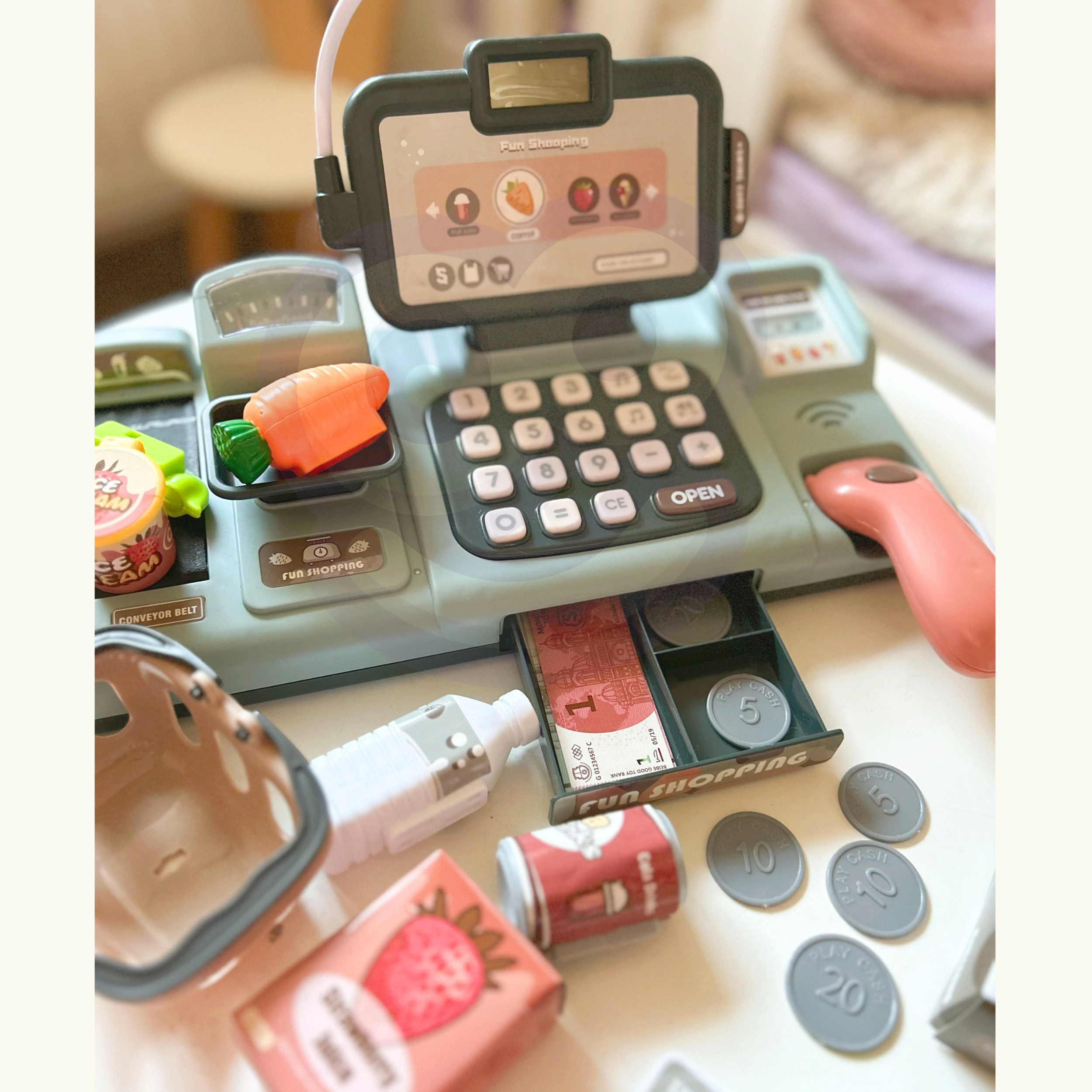 Bērnu kase ar svariem, skeneri un grozu spēlei veikalos