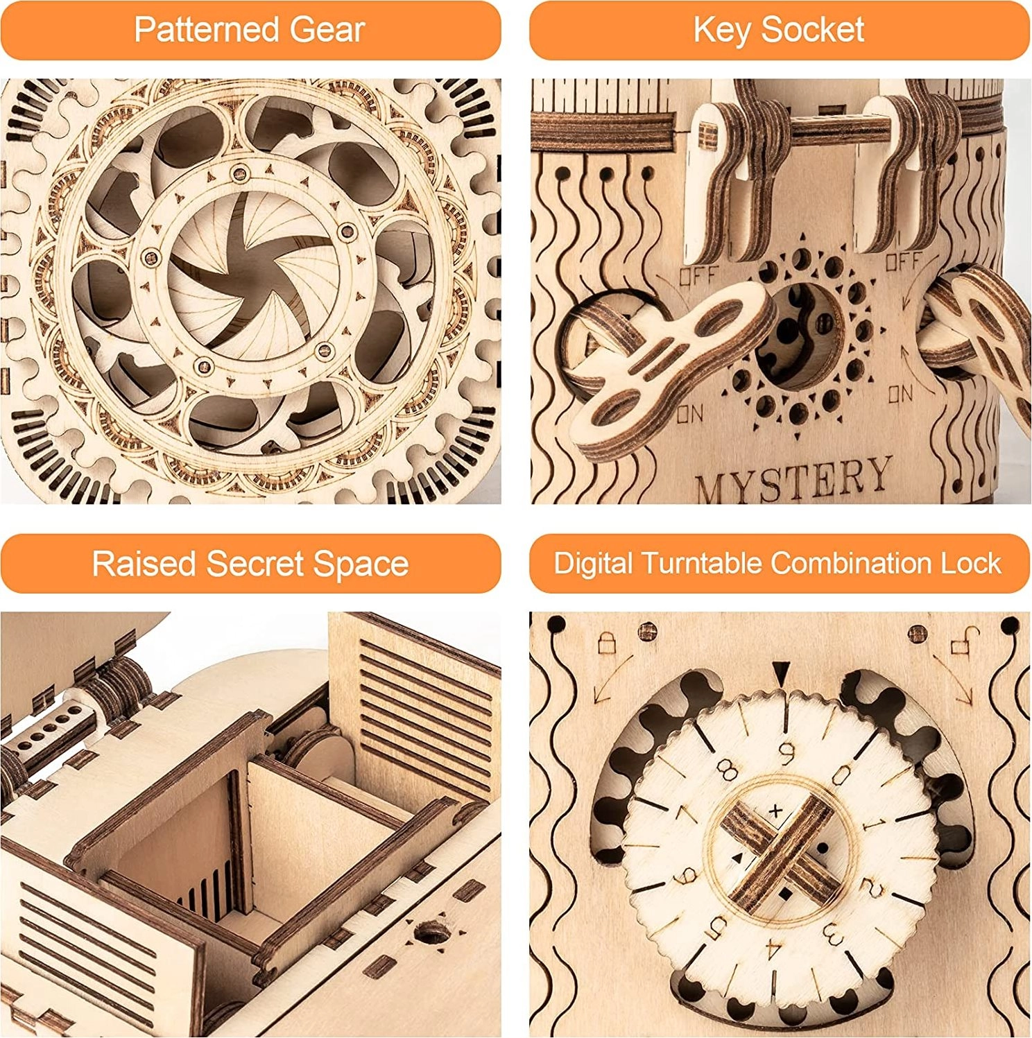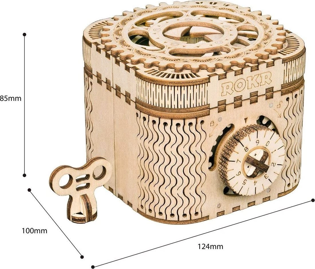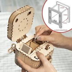Koka mehānisko pužļu rotaslietu kārbiņa no saplākšņa ir unikāla dāvana DIY entuziastiem un grezna interjera dekorācija. Salikšana ir vidējas grūtības un sniedz lielisku izaicinājumu ar 123 precīzi izgrieztām detaļām. Kārbiņai ir divi nodalījumi, tostarp galvenais, kas ir nodrošināts ar trīsciparu kodu, ko lietotājs var iestatīt no daudzām kombinācijām.