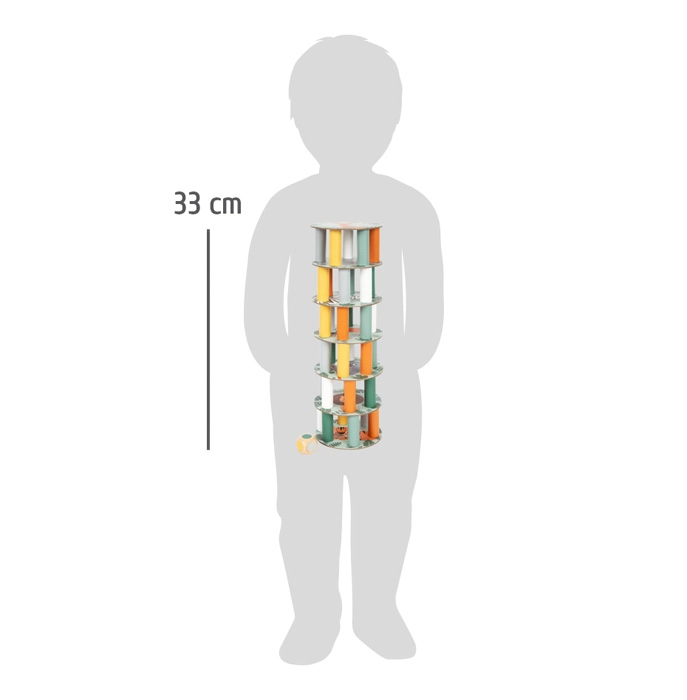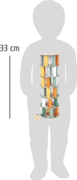 Pakāpeniski būvējiet un uzmanīgi izvelciet krāsainos cilindrus atbilstoši kauliņa krāsai – bet uzmanīgi, tornis nedrīkst sagruzt! Šī ģimenes balansa spēle katrā gājienā sniedz gan spriedzi, gan smieklus un vienlaikus dabiski veicina bērnu smalko motoriku, roku–acu koordināciju un koncentrēšanās spējas.
