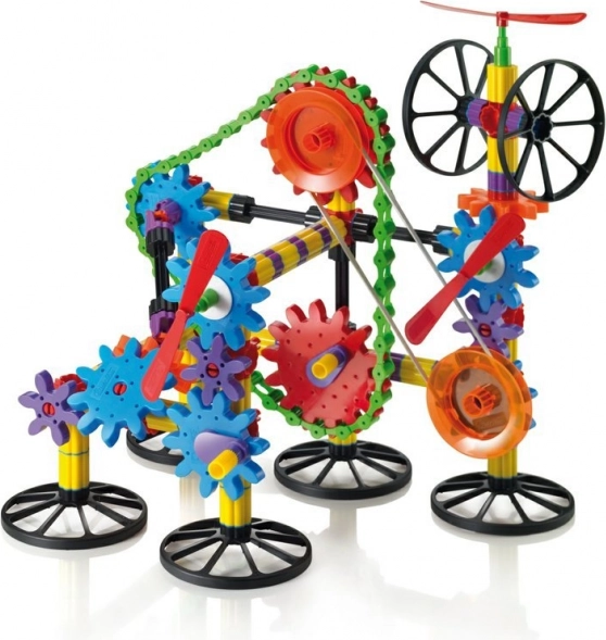 Krāsainie elementi, stieņi, riteņi un pārnesumi ļauj veidot gan vienkāršus, gan sarežģītus modeļus. Iztēlei nav robežu.