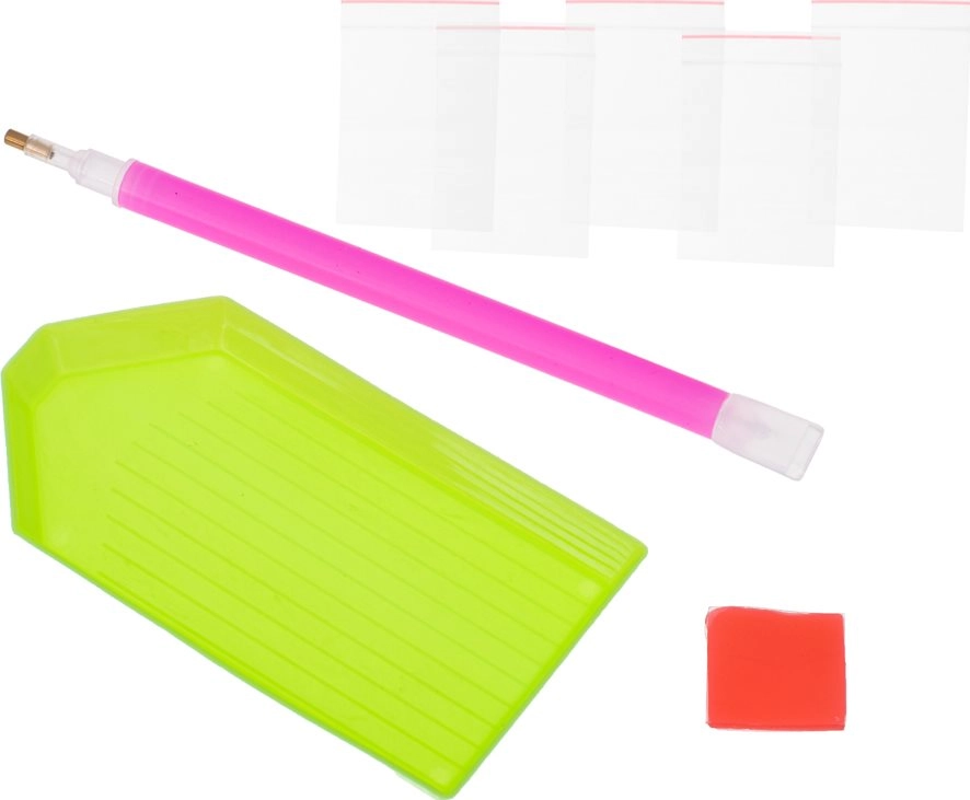 Komplektā iekļauti visi piederumi, kas nepieciešami, lai mājās ērti izveidotu unikālu dimantu gleznojumu.
