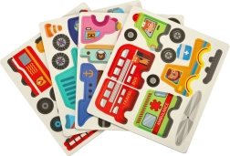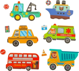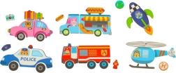 Autobuss, ātrā palīdzība, taksometrs, policijas auto, kravas auto, kuģis un raķete. Papildu elementi, piemēram, konusi un zīmes, atdzīvina jebkuru ainu.