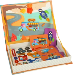 Šī magnētiskā spēle pārvērš katru “grāmatas” atvēršanu aizraujošā ceļojumā transporta pasaulē. Atliek atvērt vāku ar magnētisko virsmu, izvēlēties paraugu kartīti vai ļaut vaļu fantāzijai un no krāsainajiem magnētiem salikt savus transportlīdzekļus un ainas. Bērni ar prieku veidos ugunsdzēsēju auto, ātro palīdzību, autobusu, taksometru, policijas auto, kravas auto, kuģi un raķeti – un vēl daudz citu kombināciju.
