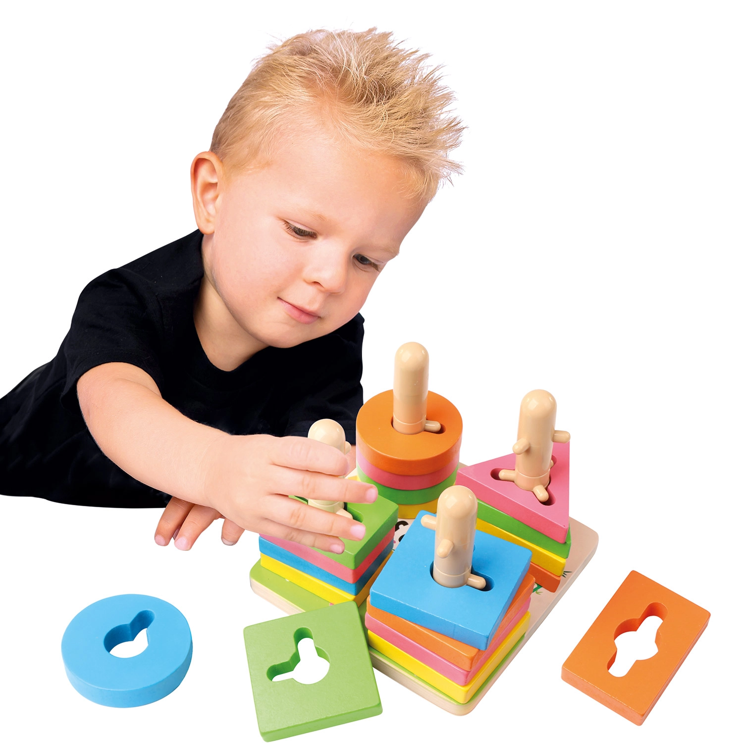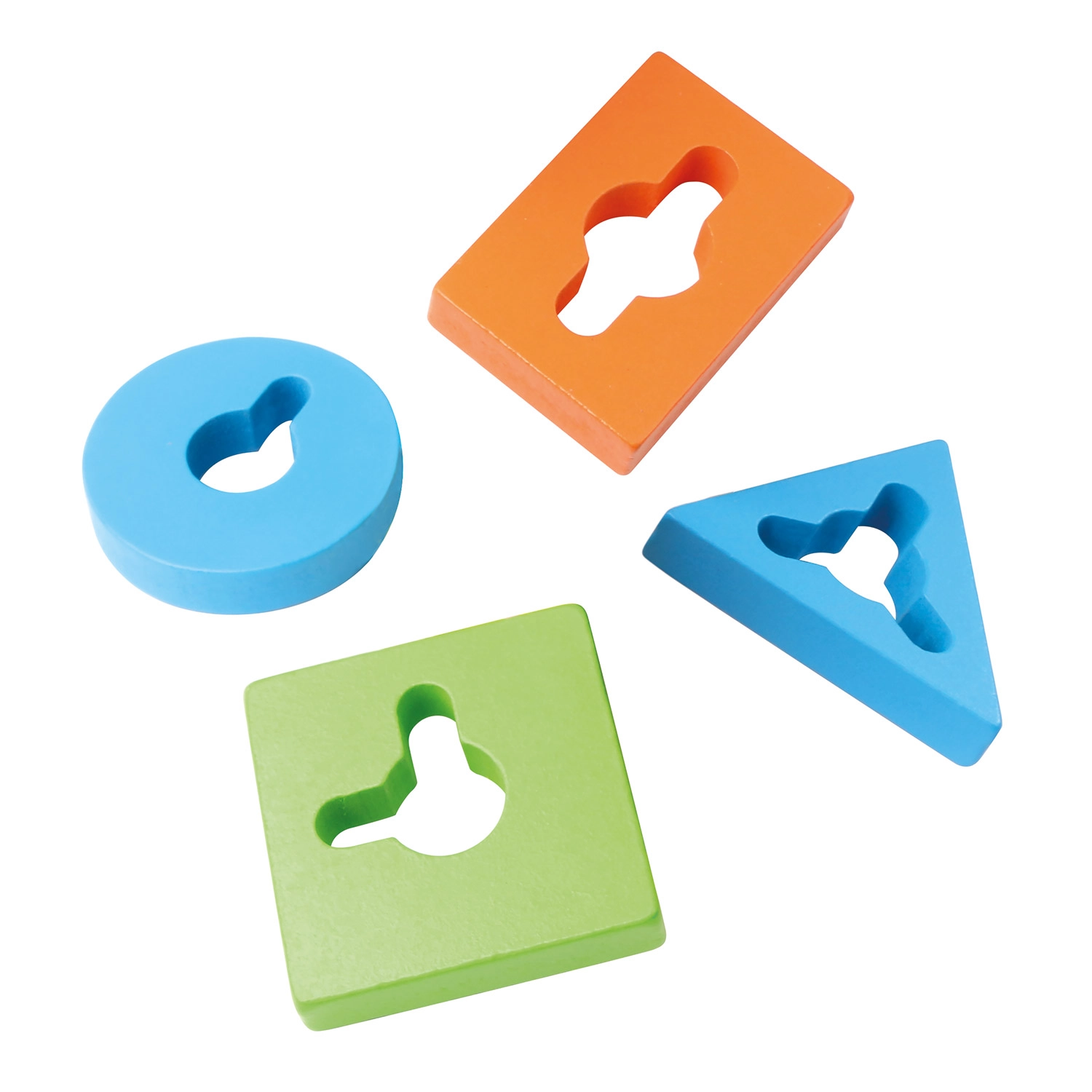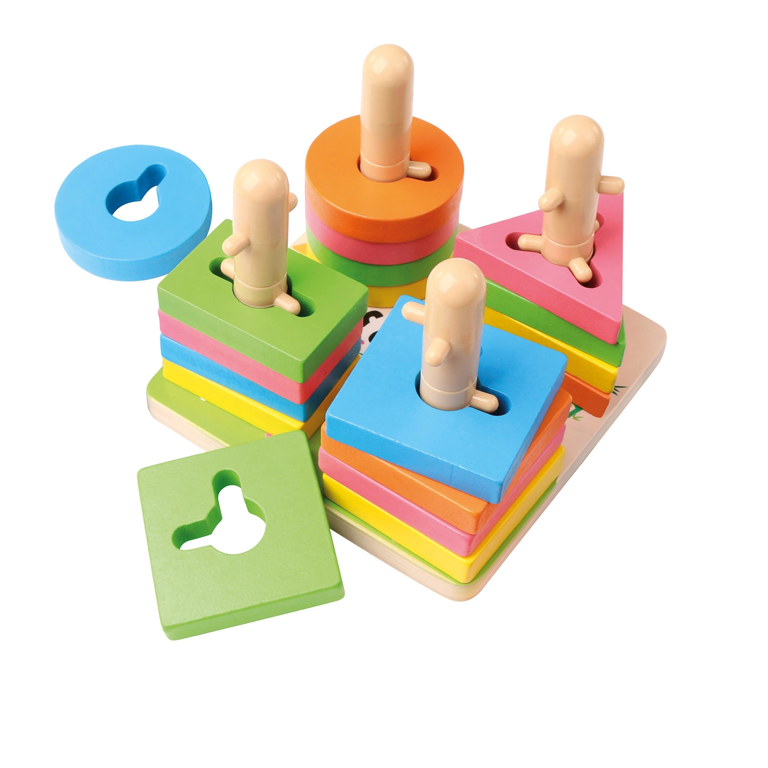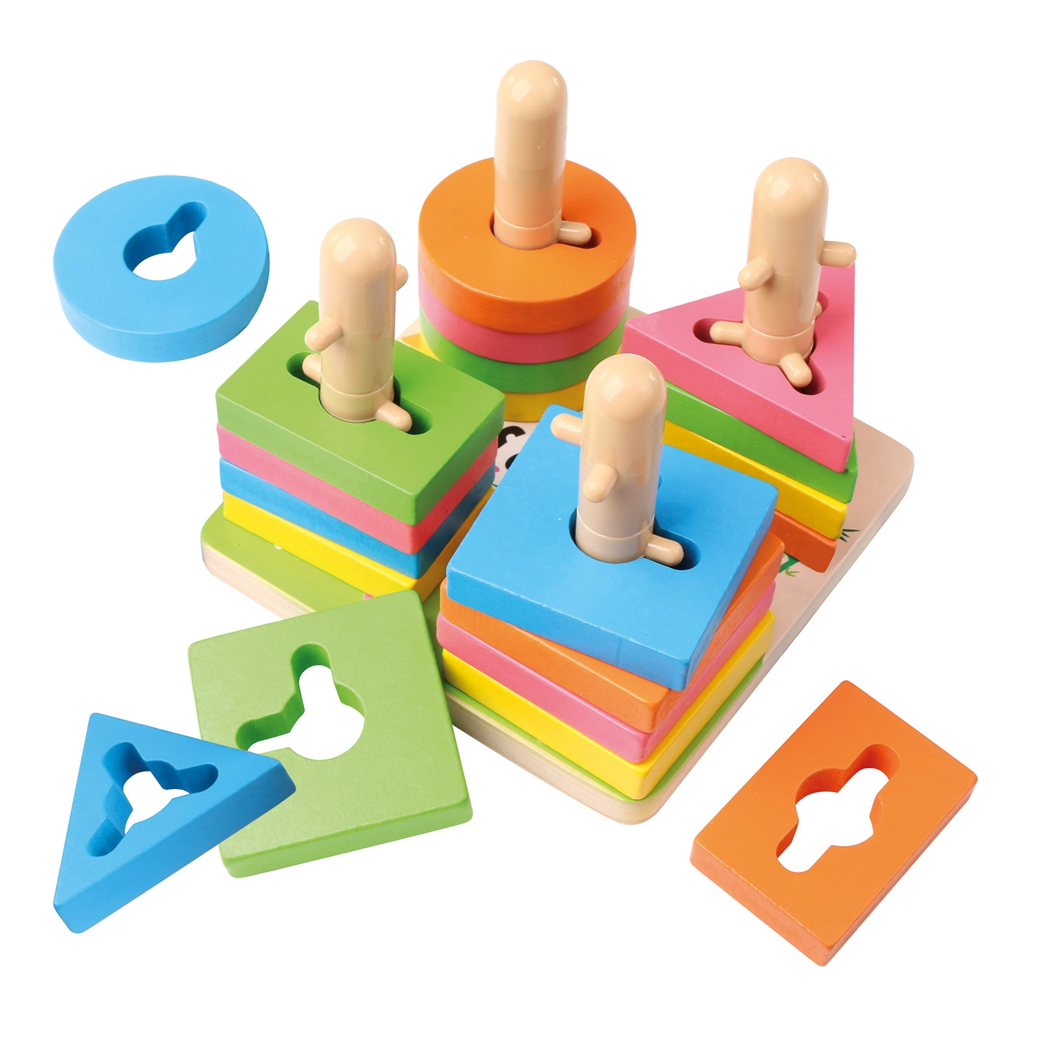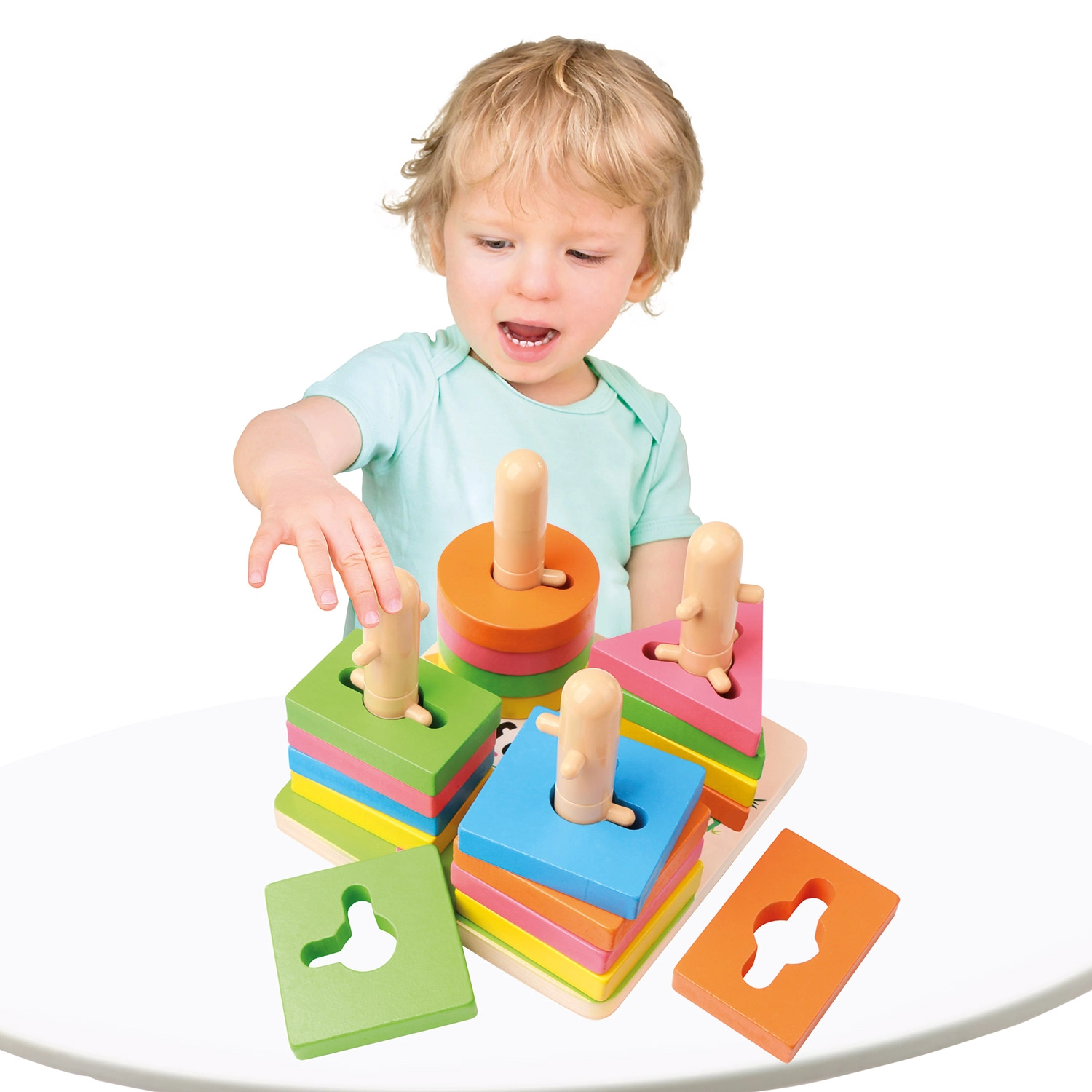 Krāsaini ģeometriski gabaliņi ar izgriezumiem mudina bērnus dabiski atpazīt formas un krāsas, vienlaikus attīstot loģiku un koncentrēšanos.