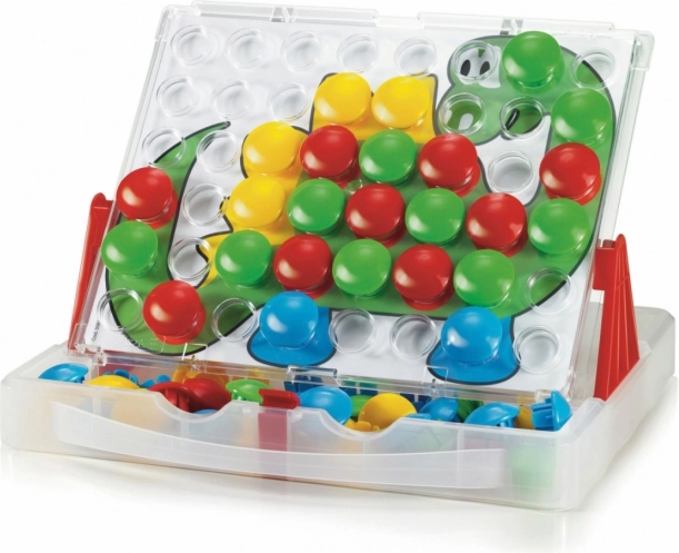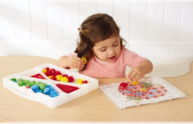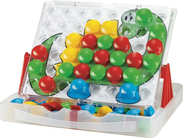 Mozaīka praktiskā koferītī ļauj bērniem veidot jautrus attēlus pēc pievienotajām šablonēm vai pēc savas fantāzijas. Plāksni var ievietot balstos un lietot arī vertikālā stāvoklī vēl ērtākai spēlēšanai. Lielās, krāsainās pogas ir drošas un viegli satveramas pat mazām bērnu rokām.