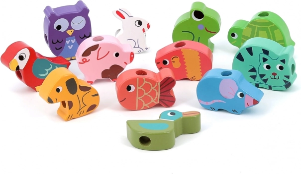Veramā rotaļlieta veicina radošumu un sīko motoriku, kad bērni ver dzīvnieku krelles uz aukliņas.