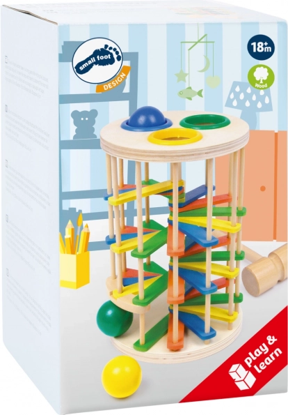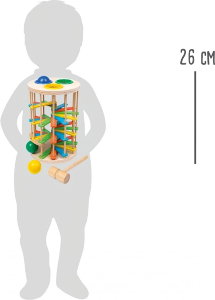 Klučināmais tornis ar bumbiņām no Small Foot ir lieliska rotaļlieta bērnu motorikas attīstībai. Tas sastāv no torņa, kur bērni ar āmuriņu iedzen 3 krāsainas bumbiņas caur plastmasas gredzeniem un vēro, kā bumbiņas ripo lejup pa kāpnēm, radot klikšķošu skaņu.