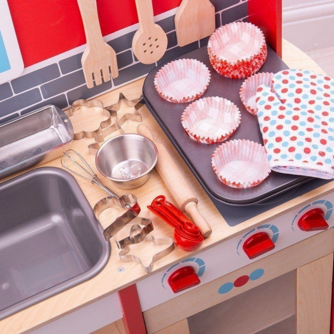 Šis visaptverošais cepšanas komplekts ietver visu aprīkojumu, kas nepieciešams katram mazajam pavāram pirmajiem cepšanas soļiem. Iekļauts cepamais plāts, cimdiņš, klaipiņa forma, putojamā slotiņa, koka rullītis, bļoda, mērkarotes komplekts un seši cepumu formiņi.