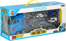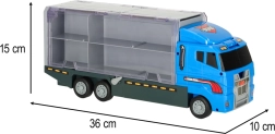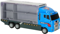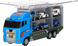 Zilais kravas auto ne tikai pārvadā līdz pat 14 transportlīdzekļiem, bet arī tā reālistiskās detaļas padara to par neatvairāmu rotaļlietu bērniem. Caurspīdamās durtiņas un palaišanas mehānisms piešķir spēlei papildu aizrautību.