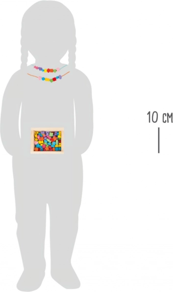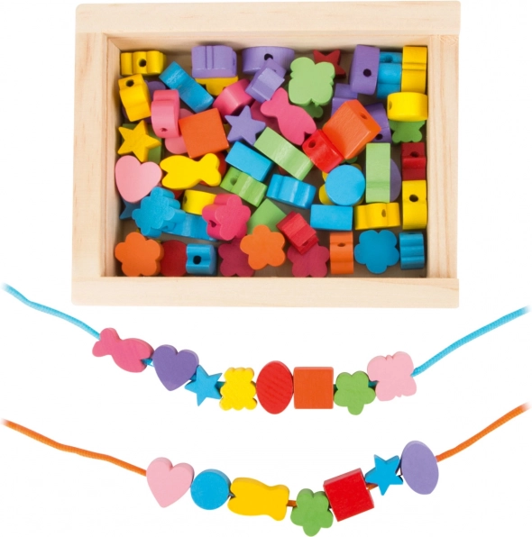 Mazie radošie prāti ar šo koka komplektu var pavadīt stundām ilgi jautri spēlējoties. Kastītē ir 81 krāsaina pērlīte un 2 aukliņas, kas ļauj bērniem veidot dažādus rotājumus pēc savas ieceres.