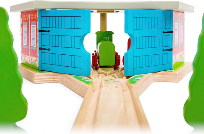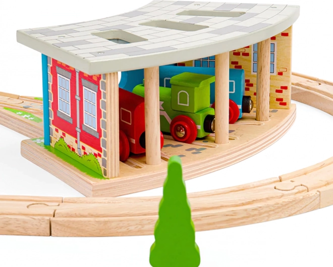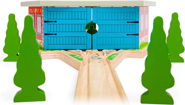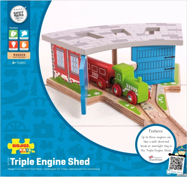Trīskāršais depo ar vārtiem ir ideāls papildinājums ikvienam mazajam mašīnistam. Ar trim stāvvietām un integrētu sliežu pieslēgumu jūs viegli sakārtosiet satiksmi uz trases un novietosiet vilcieniņus pēc dienas, kas pilna braukšanas prieka. Izturīgā koka konstrukcija ar krāsainām detaļām izskatās reālistiski un izturēs arī intensīvu spēli.