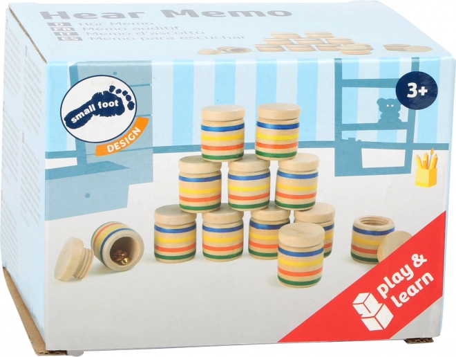 Komplektā ir 12 koka bundžiņas ar skrūvējamiem vāciņiem, kas padara šo skaņu spēli par lielisku atmiņas treneri. Katra bundžiņu pāra saturs ir vienāds, un jūsu uzdevums ir atrast atbilstošos pārus pēc skaņas. Tajās var ievietot dažādus materiālus – no pērlītēm līdz zvaniņiem – un pārbaudīt, vai spējat atšķirt nianses.