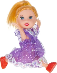 Katra lelle ir tērpta košā apģērbā — rozā, dzeltenā un violetā krāsā — ar saskaņotām sarkanām kurpēm.