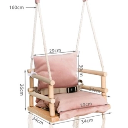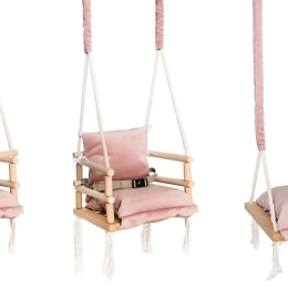 Stilīgas bērnu šūpoles bērniem no 12 mēnešu vecuma ar mīkstiem spilveniem no CLEANABOO materiāla, kas neuzsūc šķidrumus. Droša koka konstrukcija ar noapaļotām malām, izturīgām virvēm un drosības jostu ērtai un mierīgai šūpošanai mājās.