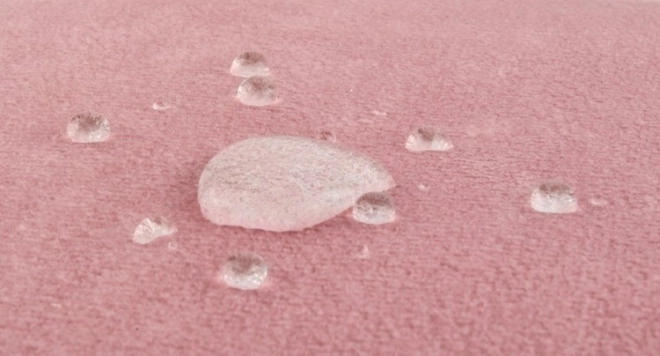 Samtaini maigs CLEANABOO materiāls neuzsūc šķidrumus uzreiz – izlijumi paliek pilienos un tos ir viegli noslaucīt.