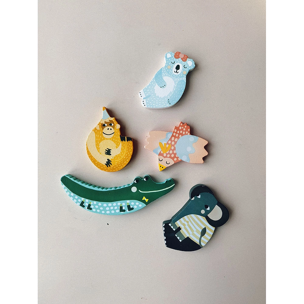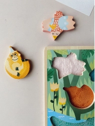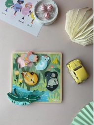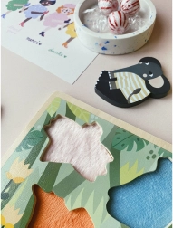 Michelle Carlslund dizains maigās pasteļkrāsās piešķir rotaļlietai pievilcīgu izskatu un rosina iztēli. Koka pamatne ar iedobumiem un dzīvnieku motīviem māca bērniem piesaistīt formas, atpazīt krāsas un dzīvniekus. Puzle ir izturīga, droša un izgatavota no kvalitatīva koka kombinācijā ar tekstilu.