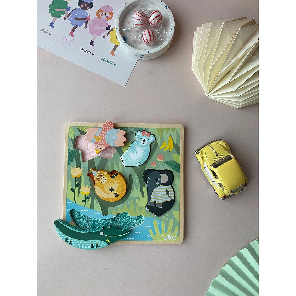 Šī kvalitatīvā koka puzle bērniem sniedz prieku no atklāšanas un mācīšanās. Izņemot katru dzīvnieciņu, zem detaļas atrodams atšķirīgs taustes pārklājums – maigs, raupjš vai reljefains, kas dabiski attīsta taustes sajūtas un veicina maņu integrāciju. Izturīgās, viegli satveramās detaļas lieliski piemērotas mazām rociņām.