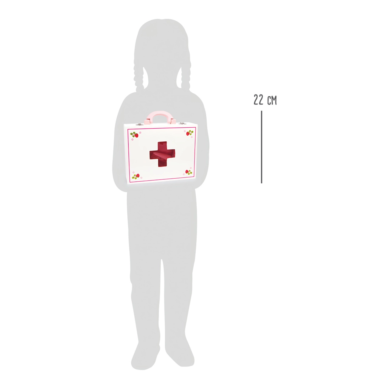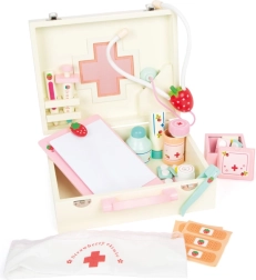 Šis kvalitatīvais koka ārsta koferītis Small Foot Isabel ir ideāli piemērots bērnu lomu spēlēm. Komplektā ir 24 piederumu vienības, tostarp tekstila galvas apsējs ar sarkanu krustu un krāsaini medicīnas instrumenti ar zemeņu motīvu, kas iepriecinās ikvienu bērnu.