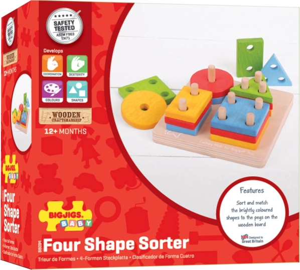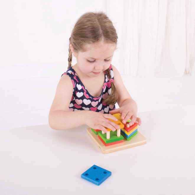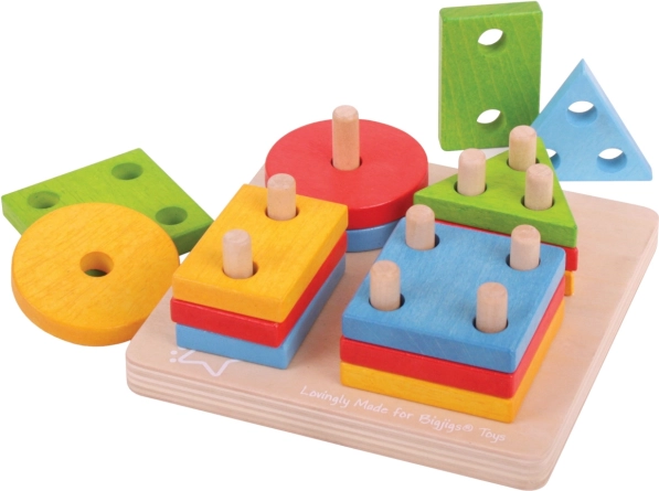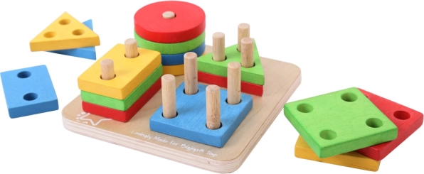 Šī koka liktspēle ar pamatni, tapām un košām ģeometriskām formām (apļi, kvadrāti, trīsstūri, taisnstūri) sniedz bērniem prieku atklāt un mācīties. Uzliekot atsevišķās detaļas, bērni trenē satvērienu, roku–acu koordināciju un loģisko domāšanu, vienlaikus dabiskā veidā apgūst krāsu un formu atšķiršanu un pirmo skaitīšanu.