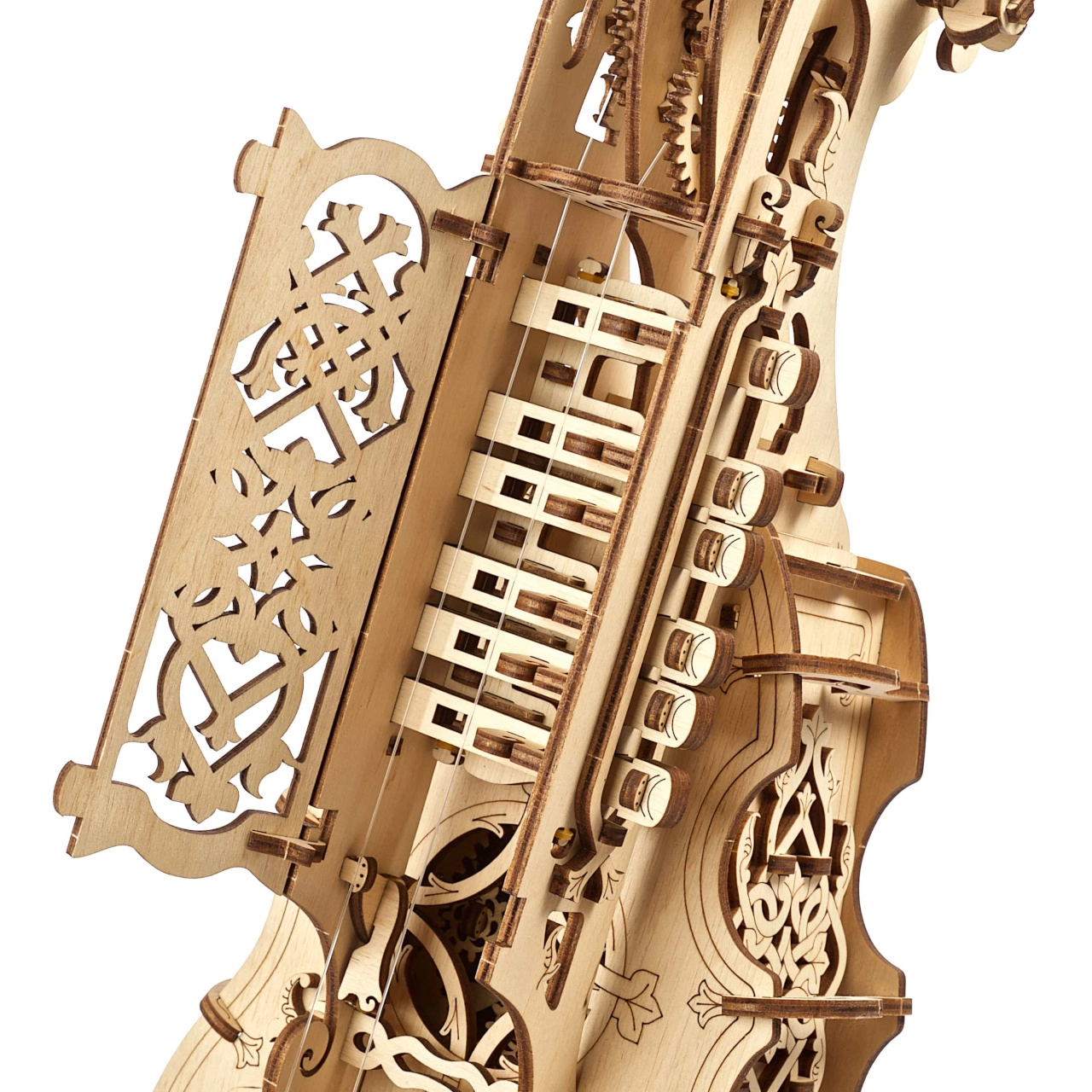 292 precīzi ar lāzeru izgriezti finiera elementi savienojas bez līmes. Dekoratīvie ornamenti un redzamie pārnesumi padara to par pievilcīgu interjera akcentu.