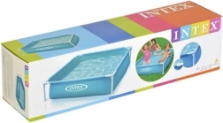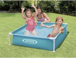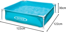 Kompakts bērnu rāmja baseins INTEX ar izmēriem 122 × 122 × 30 cm un tilpumu 342 l nodrošina drošu izklaidi, ātru montāžu un izturīgu konstrukciju vasaras atspirdzinājumam dārzā, terasē vai uz balkona.