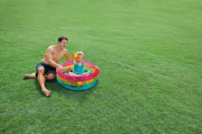 Jautrs uzpūšamais baseins ar bumbiņām no INTEX pārvērtīs jebkuru bērnu istabu vai dārzu drošā rotaļu laukumā. Caurspīdīgas sienas ar rozā, dzeltenu un zilu svītru. Izturīgs PVC materiāls nodrošina vieglu kopšanu un ilgu kalpošanas laiku, ideāli piemērots bērniem no 1 līdz 3 gadiem.