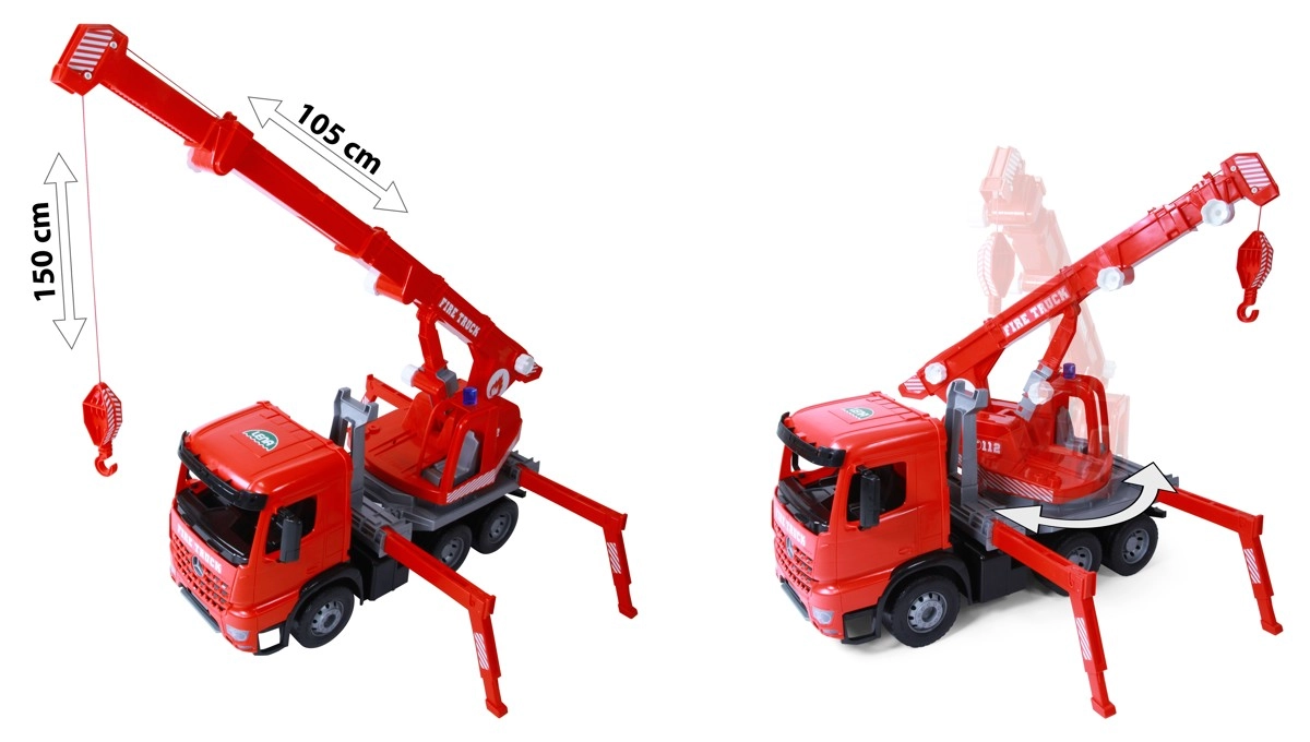 Šis sarkanais autokrāns MERCEDES ACTROS no Lena iepriecinās visus mazos būvētājus. Pateicoties rotējošai strēlei, funkcionālai vinčai ar trosi, izbīdāmām stabilizatora kājām un riteņu ķīļiem, tas nodrošina bērniem autentisku un drošu spēli ar reālistiskām funkcijām. Tas ir ražots Čehijā no izturīgas plastmasas un piemērots gan iekštelpām, gan ārā.