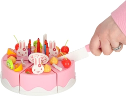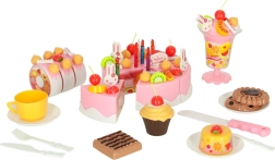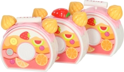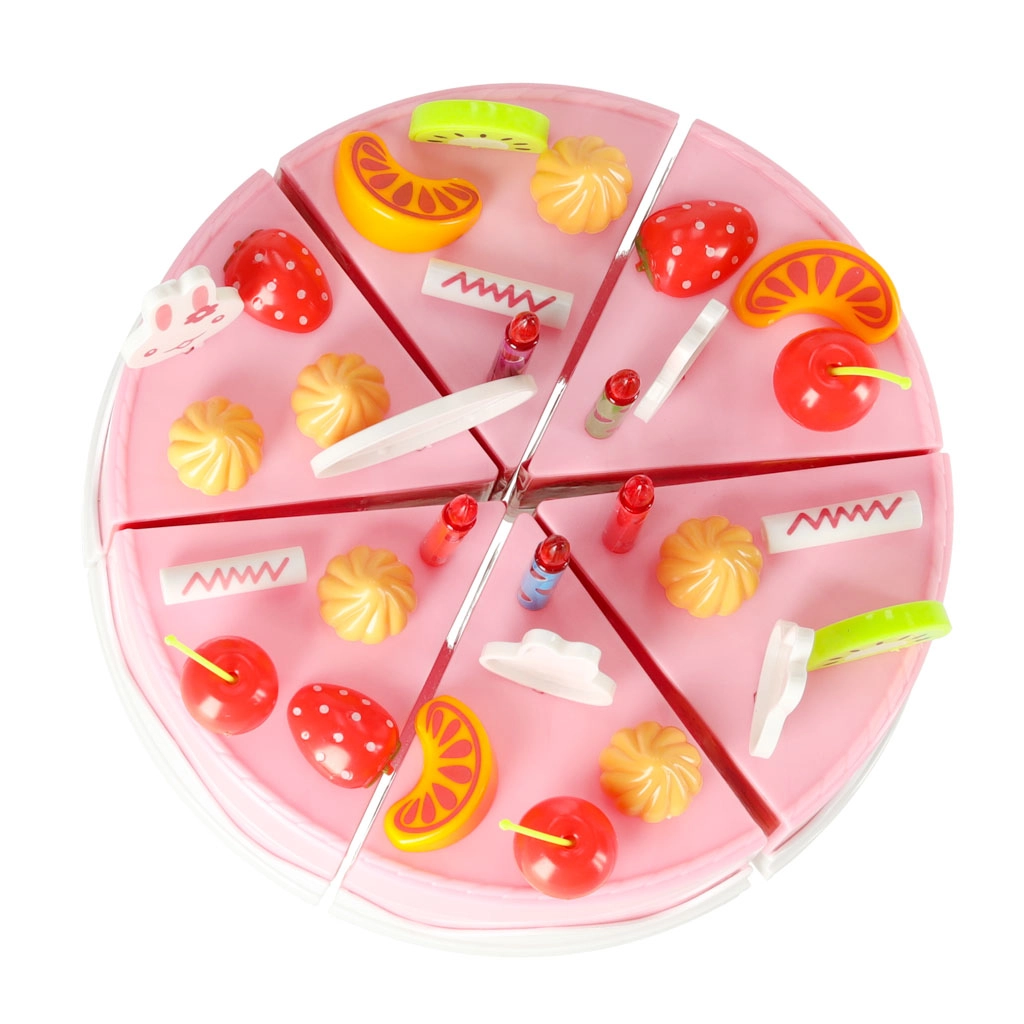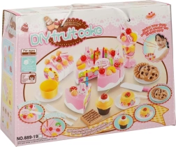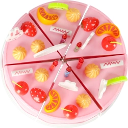 Jautrs rozā komplekts ar griežamu kūku iepriecinās mazos konditorus no 3 gadu vecuma. Kūka no 6 daļām savienota ar lipekļiem un to var sagriezt ar plastmasas nazi. Bagātīgais augļu, dekoru un piederumu klāsts attīsta iztēli, lomu spēles un sīko motoriku.
