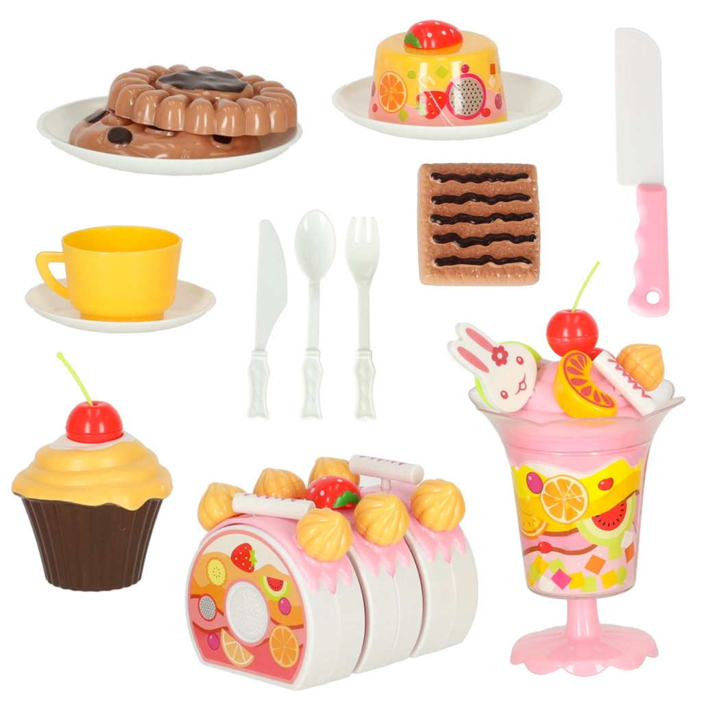 - 6 kūkas daļas, 5× svecīte, 14× bezē cepumiņš, 7× cukura nūjiņa, 4× ķiršiņš, 4× mandarīns, 3× zemenes, 3× kivi, 4× trušītis, plāksnīte “Happy Birthday”, 3× šķīvītis, 3× cepums, 3× rulešu gabaliņš, krūzīte, tējkarote, dakša, nazītis, kūkas lāpstiņa, saldējuma glāze, uzlīmes, lipekļu komplekts