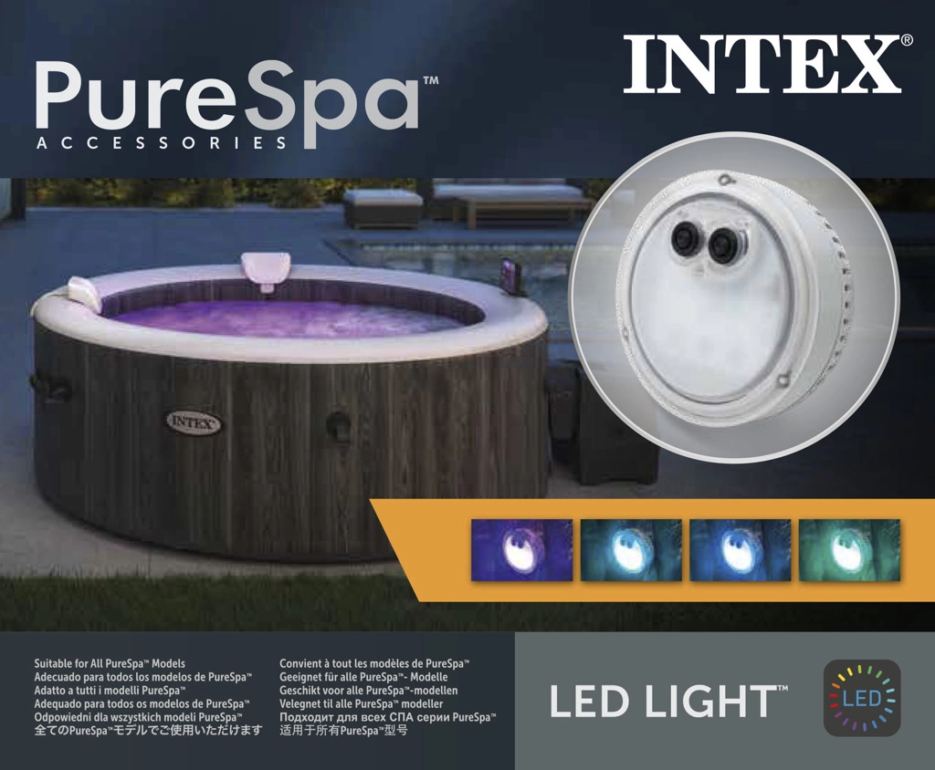 Izveidojiet mājās SPA noskaņu. Šī daudzkrāsu LED lampa pārvērš ūdeni virpuļvannā par gaismu un krāsu spēli, kas rada relaksāciju un mieru. Pateicoties saderībai ar INTEX PureSpa, tā lieliski ieguļ paredzētajā vietā un darbojas uzticami bez sarežģītas uzstādīšanas.