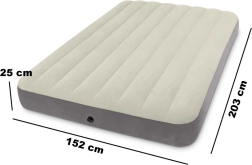 Uzpūšamais matracis INTEX piedāvā ērtu un stabilu gulēšanu divām personām. Pateicoties ūdensizturīgajai velūra virsmai, tas ir patīkams pieskārienam un neslīd, savukārt izturīgais PVC nodrošina ilgu kalpošanas laiku gan mājās, gan ceļā.