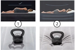 Integrētā kāju pumpe ļauj viegli uzpūst bez elektrības. Matraci var arī piepumpēt ar parastu pumpi caur ventili.